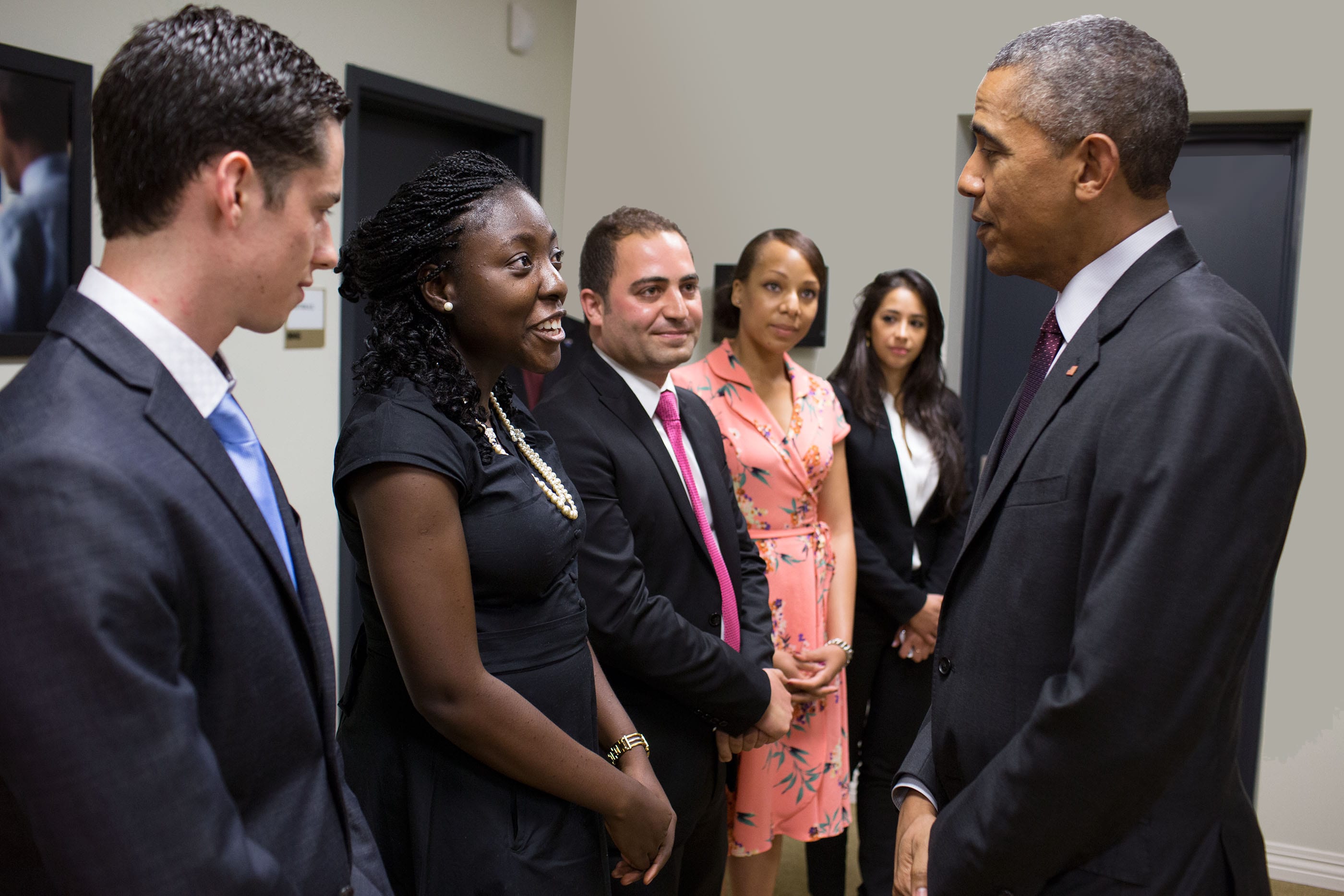 President Barack Obama greets young entrepreneurs in the vestibule of the Eisenhower Executive Office Building South Court Auditorium prior to remarks at the 2015 Presidential Ambassadors for Global Entrepreneurship (PAGE) and Young Entrepreneurs event, May 11, 2015. (Official White House Photo by Pete Souza)